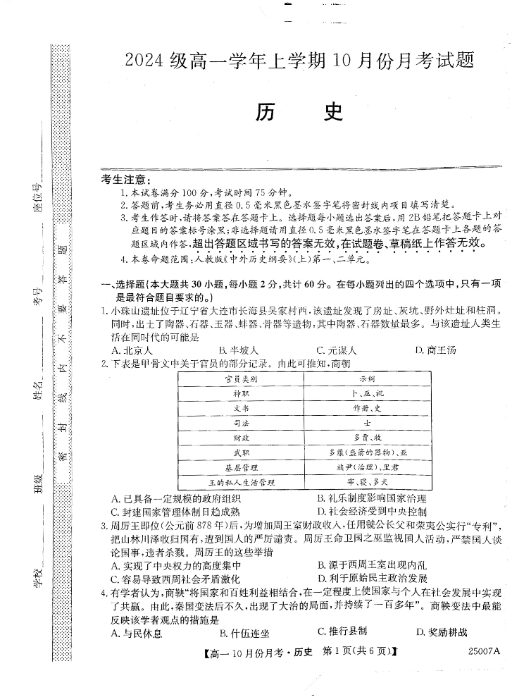 黑龙江省龙东联盟2024级高一学年上学期10月份月考试题历史