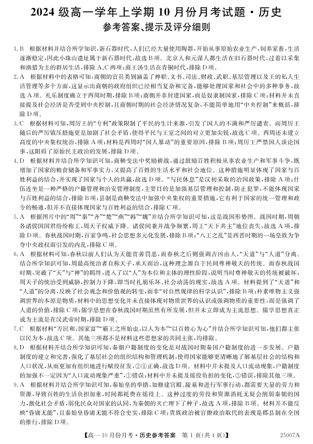 黑龙江省龙东联盟2024级高一学年上学期10月份月考试题历史答案