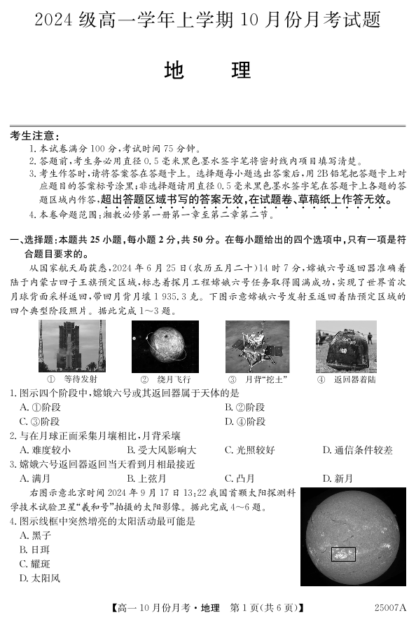 黑龙江省龙东联盟2024级高一学年上学期10月份月考试题地理