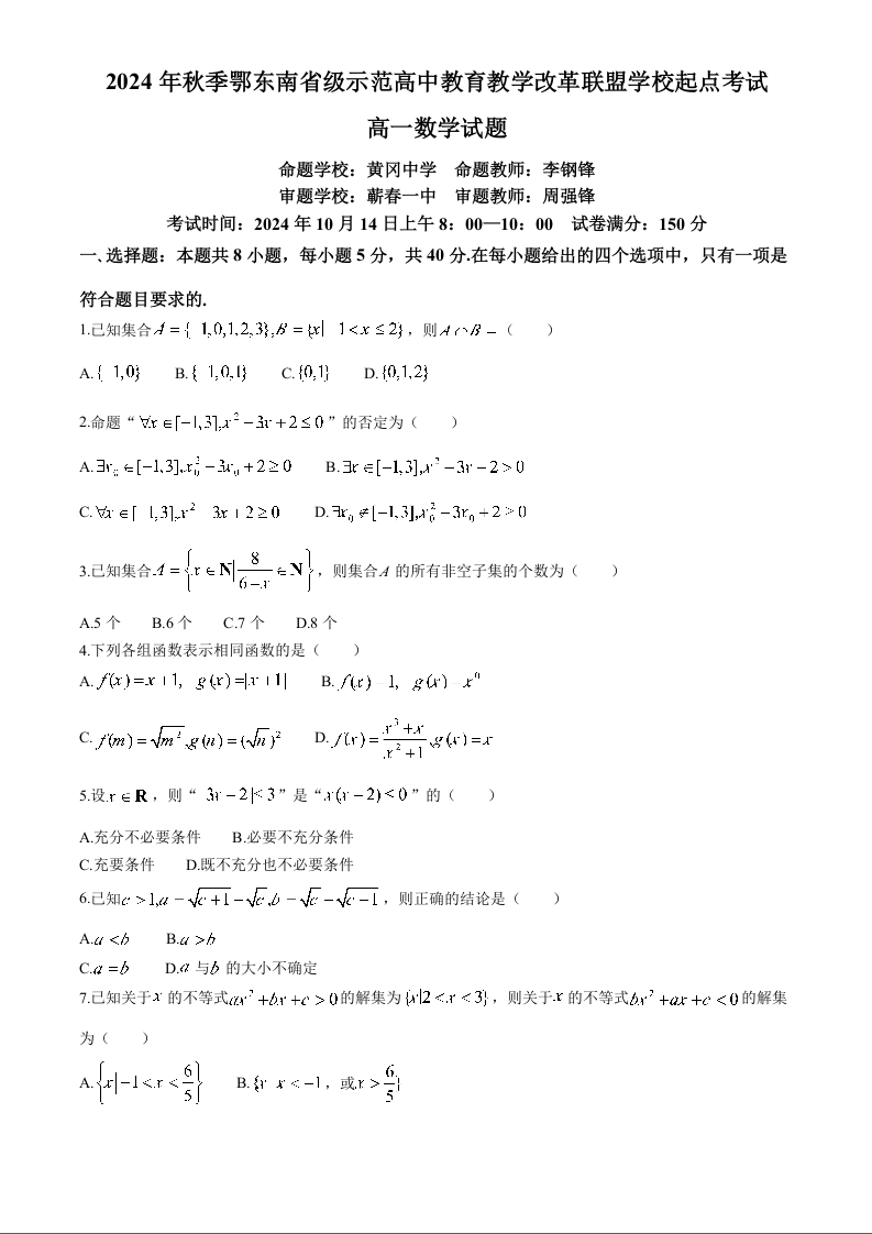 湖北省2024年秋季鄂东南省级示范高中教育教学改革联盟学校起点考试数学+答案