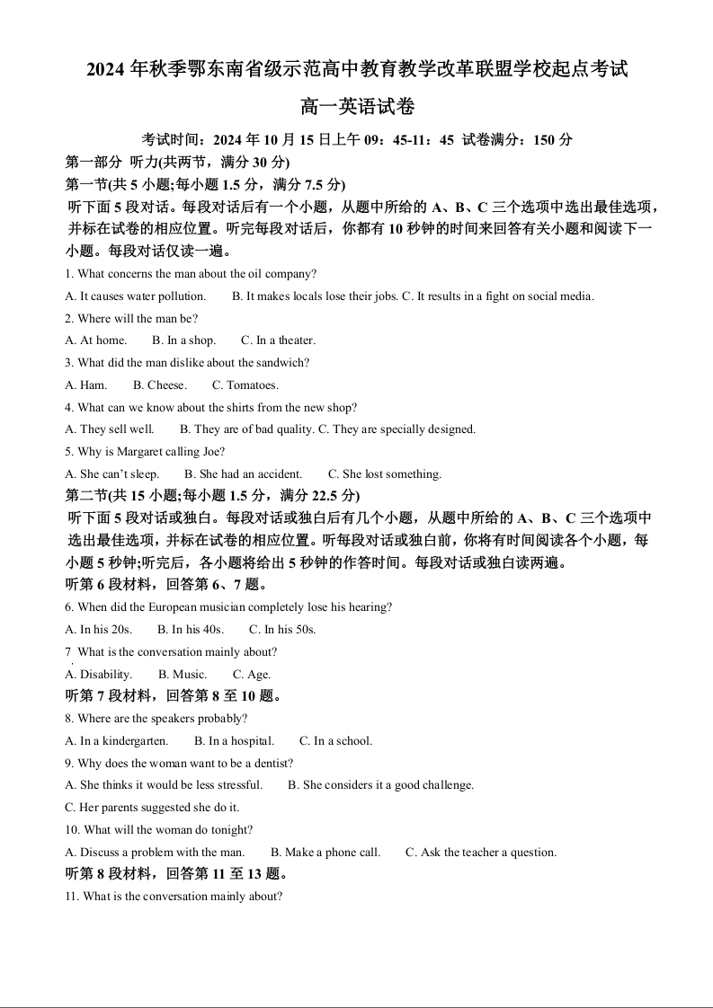 湖北省2024年秋季鄂东南省级示范高中教育教学改革联盟学校起点考试英语+答案