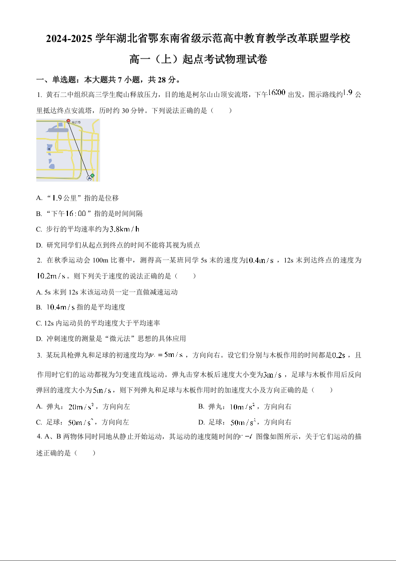 湖北省2024年秋季鄂东南省级示范高中教育教学改革联盟学校起点考试物理
