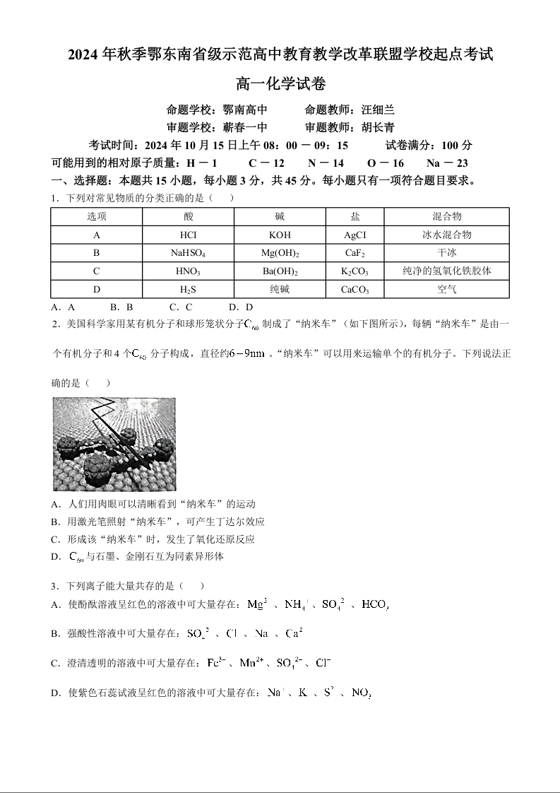 湖北省2024年秋季鄂东南省级示范高中教育教学改革联盟学校起点考试化学+答案
