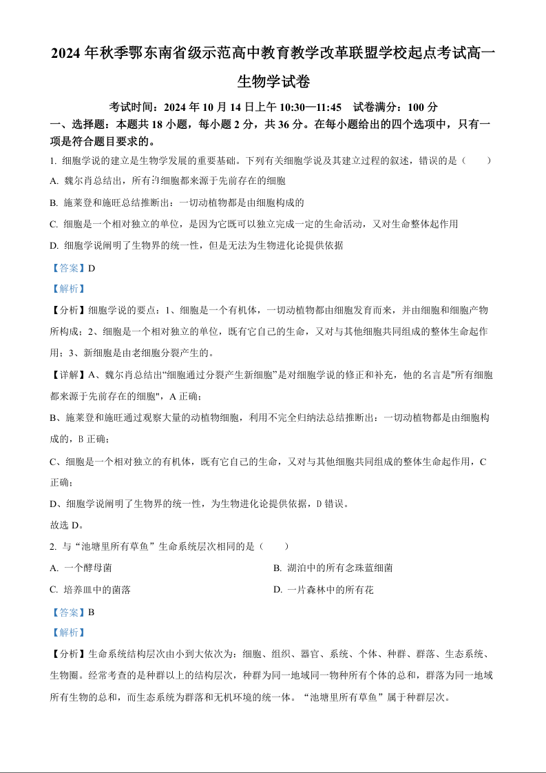 湖北省2024年秋季鄂东南省级示范高中教育教学改革联盟学校起点考试生物+答案