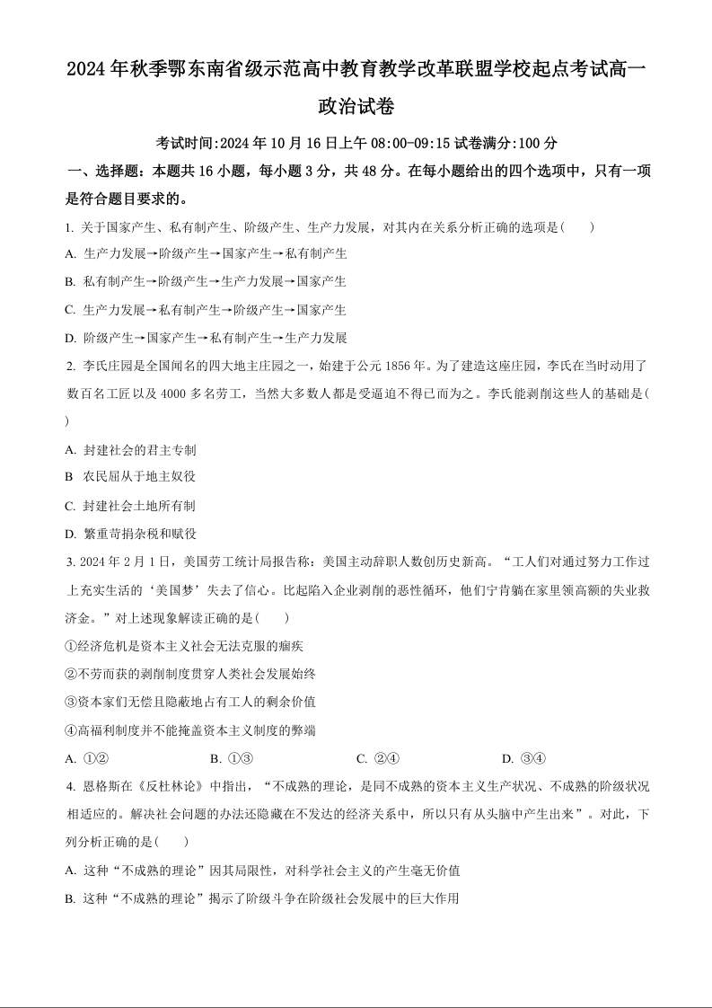 湖北省2024年秋季鄂东南省级示范高中教育教学改革联盟学校起点考试政治