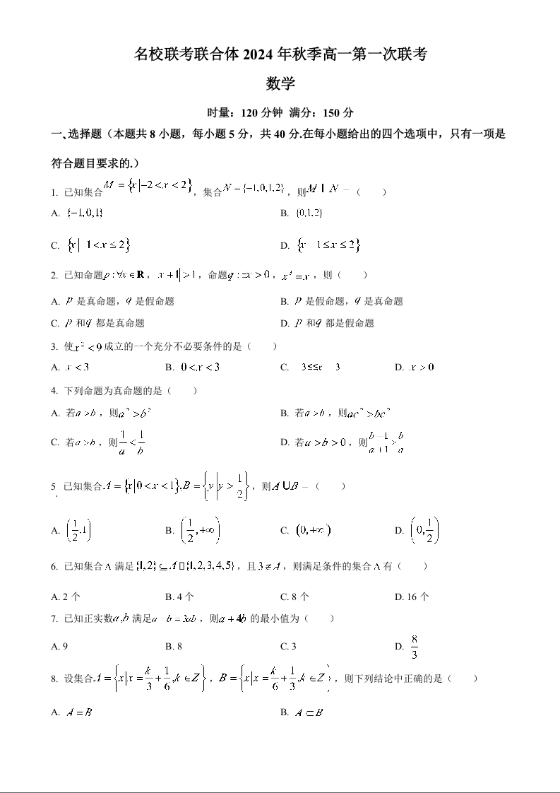 湖南省名校联考联合体2024年秋季高一第一次联考数学
