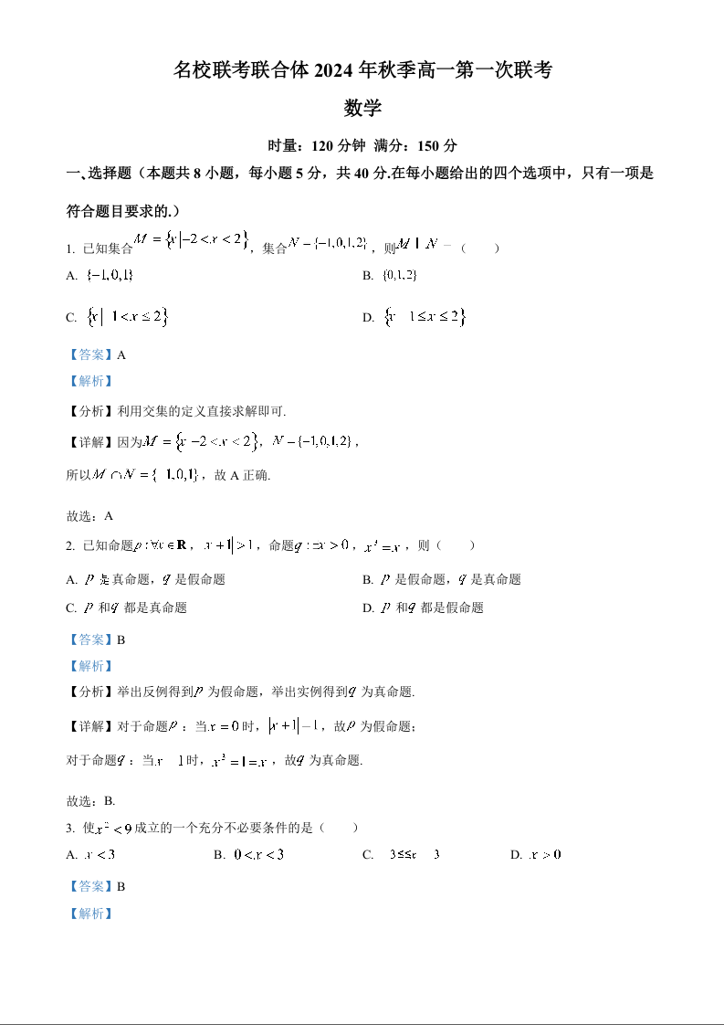湖南省名校联考联合体2024年秋季高一第一次联考数学答案