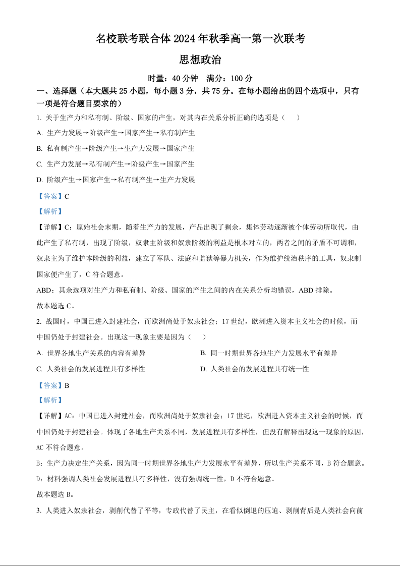 湖南省名校联考联合体2024年秋季高一第一次联考政治答案