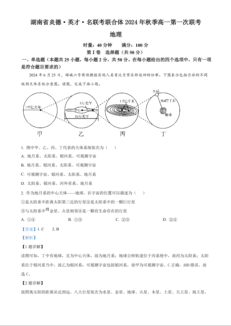 湖南省名校联考联合体2024年秋季高一第一次联考地理答案