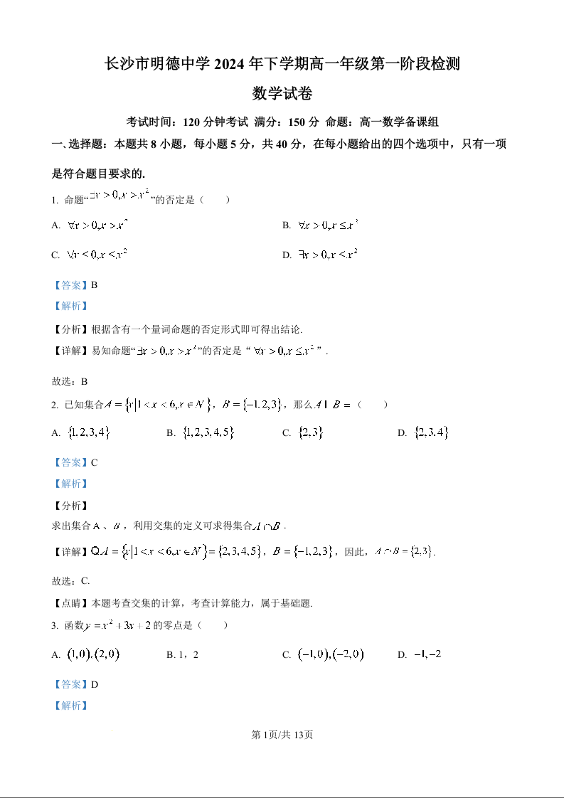 湖南省长沙市明德中学2024年下学期高一年级第一阶段检测数学(解析版)