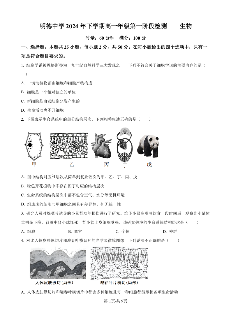 湖南省长沙市明德中学2024年下学期高一年级第一阶段检测生物(原卷版)