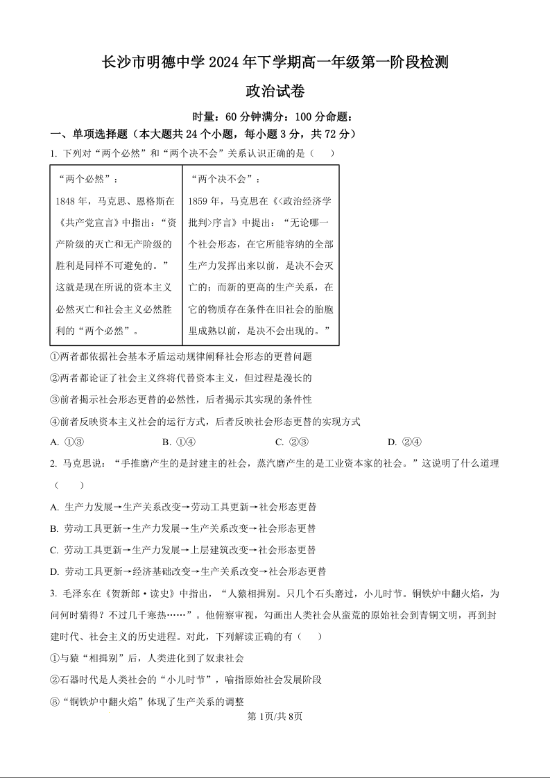 湖南省长沙市明德中学2024年下学期高一年级第一阶段检测政治(原卷版)