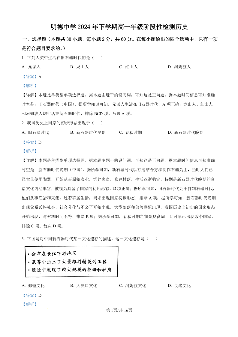 湖南省长沙市明德中学2024年下学期高一年级第一阶段检测历史(解析版)
