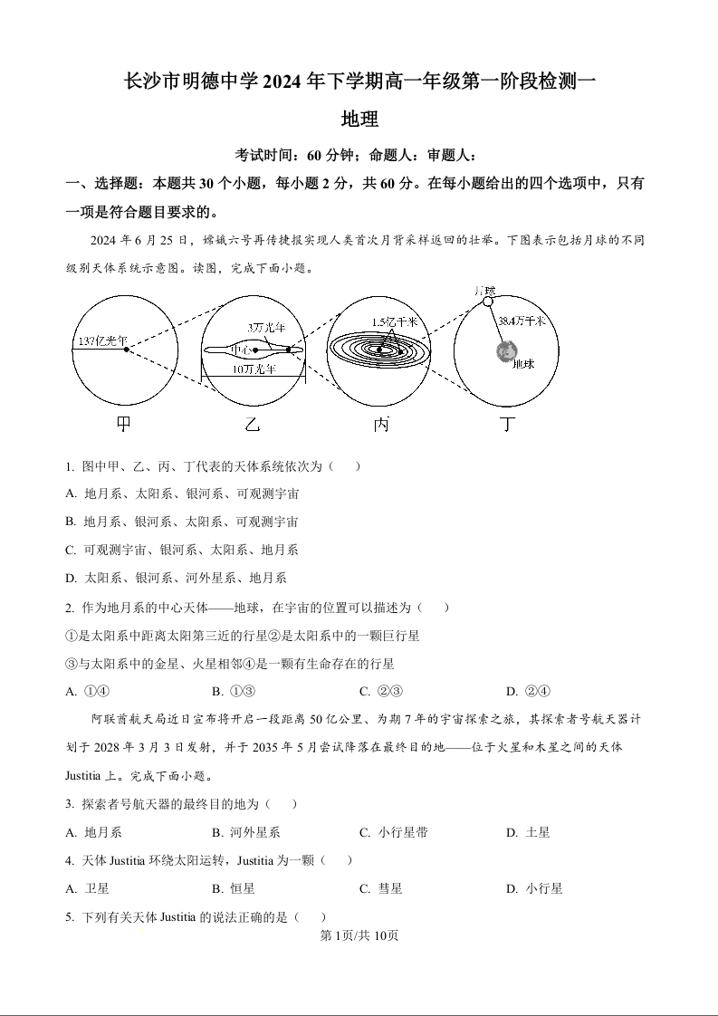 湖南省长沙市明德中学2024年下学期高一年级第一阶段检测地理(原卷版)