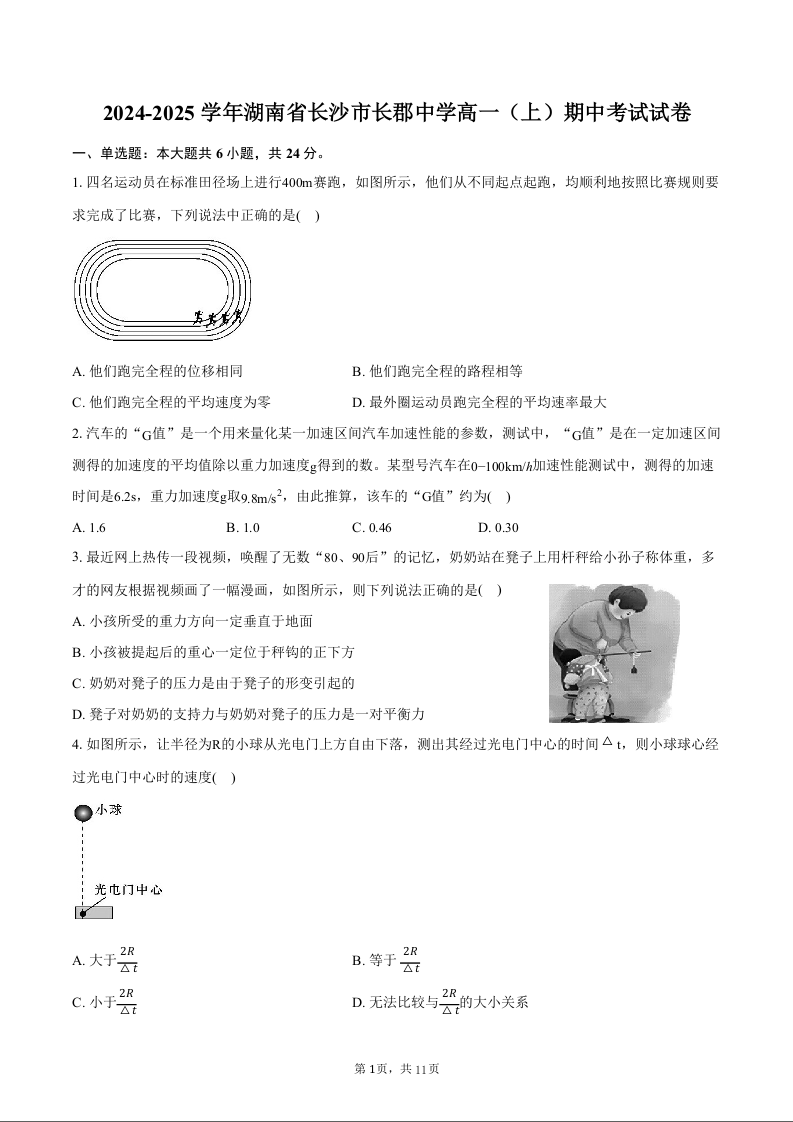 湖南省长沙市长郡中学2024年下学期高一期中考试物理+答案