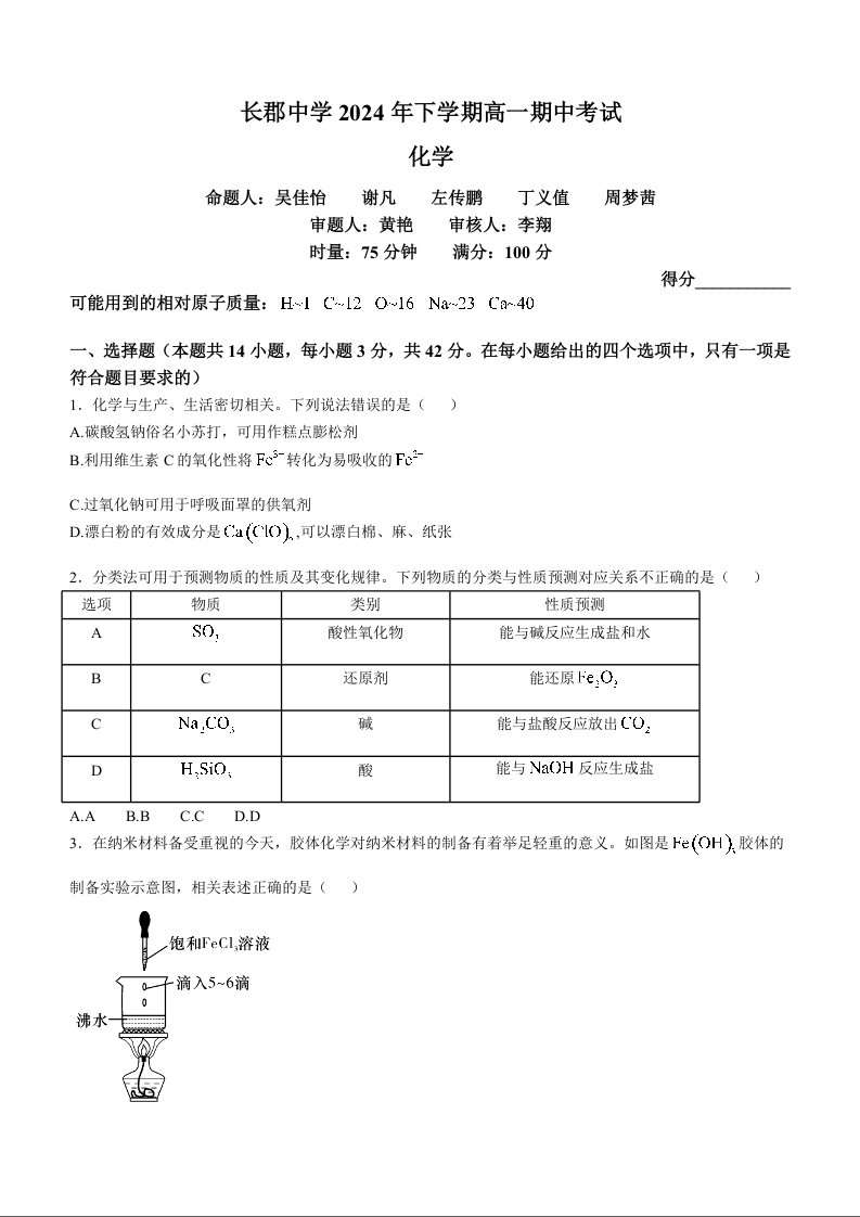 湖南省长沙市长郡中学2024年下学期高一期中考试化学+答案