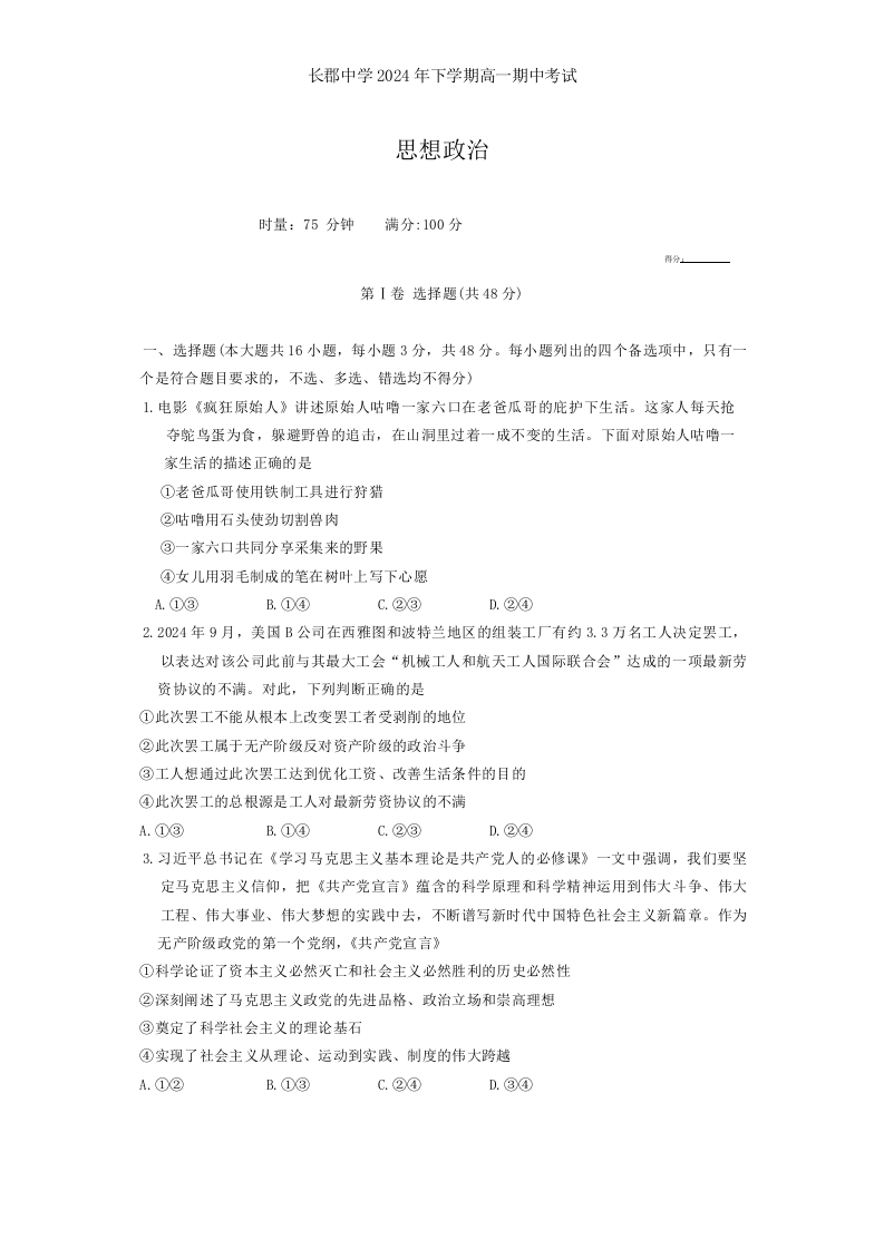 湖南省长沙市长郡中学2024年下学期高一期中考试政治