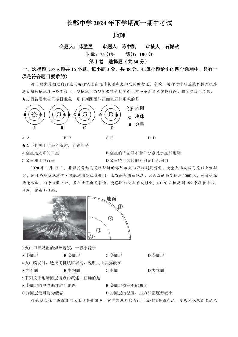 湖南省长沙市长郡中学2024年下学期高一期中考试地理+答案