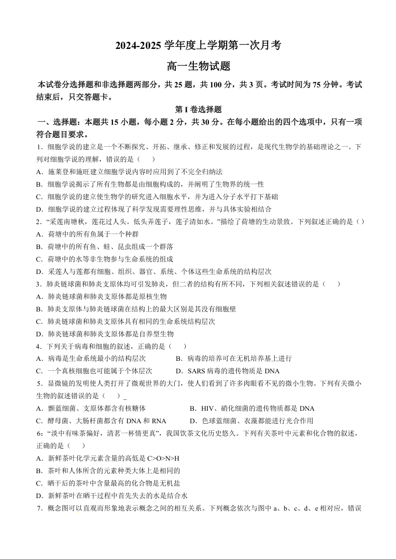 吉林省部分学校2024-2025学年度上学期第一次月考生物+答案