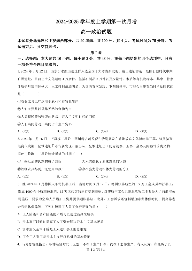 吉林省部分学校2024-2025学年度上学期第一次月考政治(原卷版)
