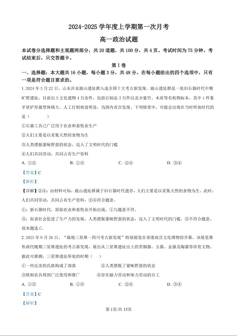 吉林省部分学校2024-2025学年度上学期第一次月考政治(解析版)