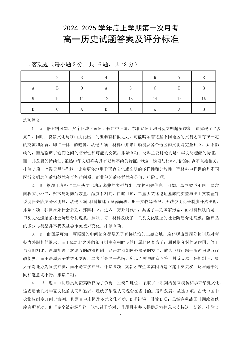 吉林省部分学校2024-2025学年度上学期第一次月考历史答案
