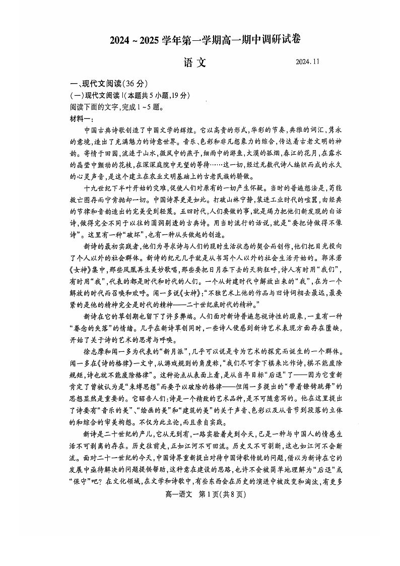 江苏省苏州市2024~2025学年第一学期高一期中调研试卷语文