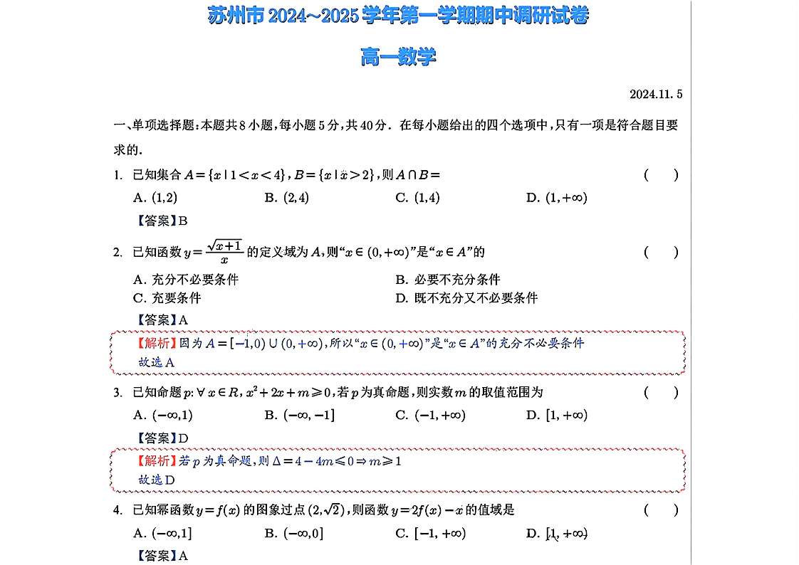 江苏省苏州市2024~2025学年第一学期高一期中调研试卷数学答案
