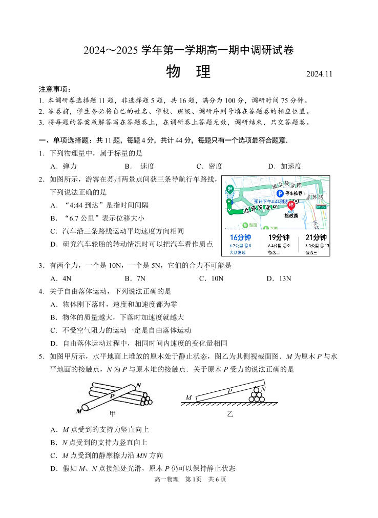 江苏省苏州市2024~2025学年第一学期高一期中调研试卷物理+答案