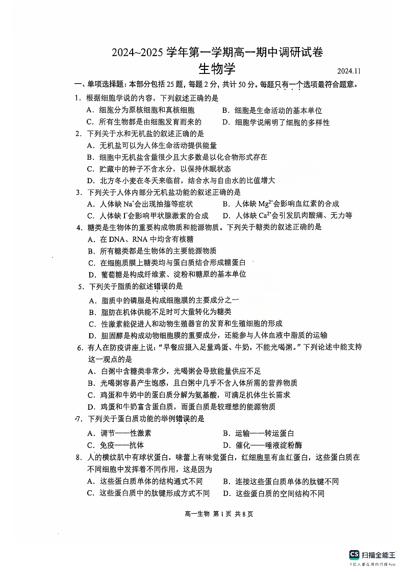 江苏省苏州市2024~2025学年第一学期高一期中调研试卷生物+答案