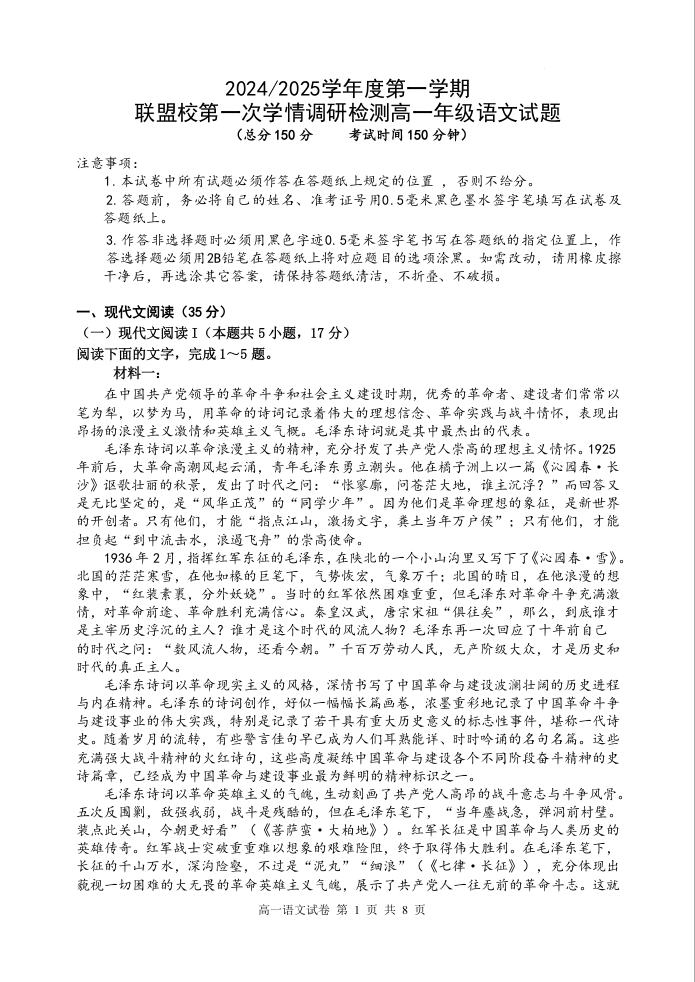 江苏省盐城市五校联考2024-2025学年度第一学期联盟校第一次学情调研检测语文