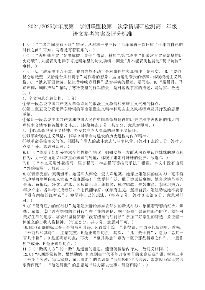 江苏省盐城市五校联考2024-2025学年度第一学期联盟校第一次学情调研检测语文答案