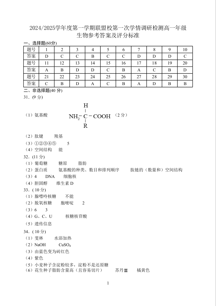 江苏省盐城市五校联考2024-2025学年度第一学期联盟校第一次学情调研检测生物答案
