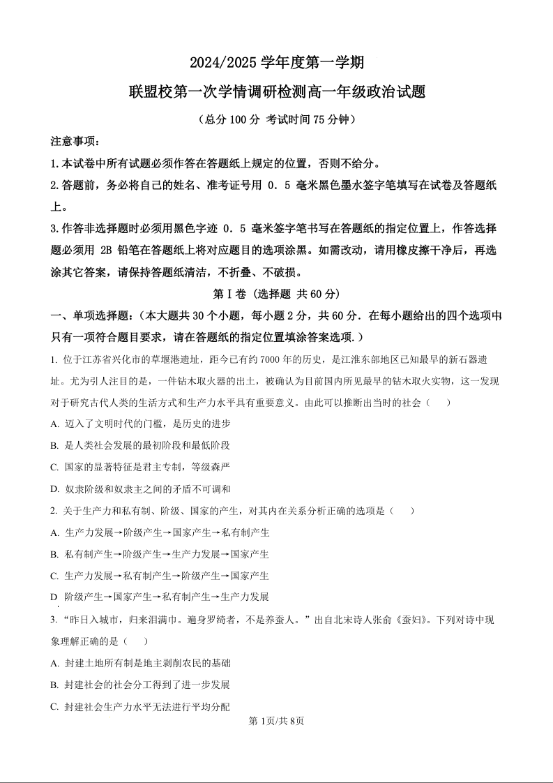 江苏省盐城市五校联考2024-2025学年度第一学期联盟校第一次学情调研检测政治(原卷版)