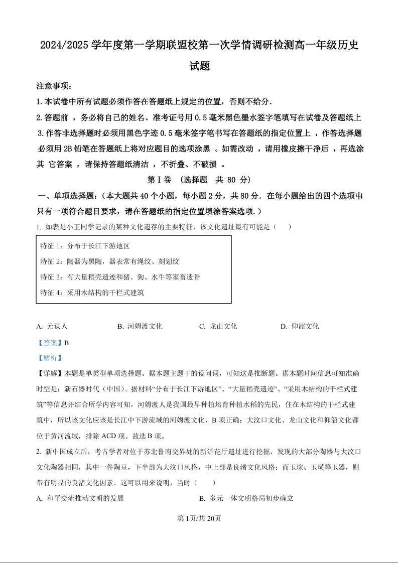 江苏省盐城市五校联考2024-2025学年度第一学期联盟校第一次学情调研检测历史(解析版)