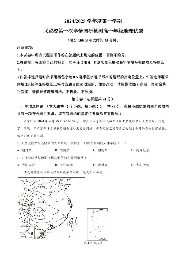江苏省盐城市五校联考2024-2025学年度第一学期联盟校第一次学情调研检测地理(原卷版)