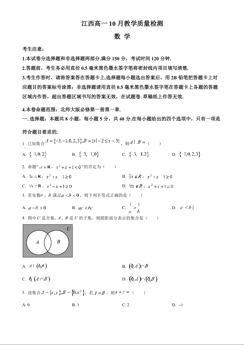 江西省名校联盟2023-2024学年高一上学期10月质量检测数学+答案
