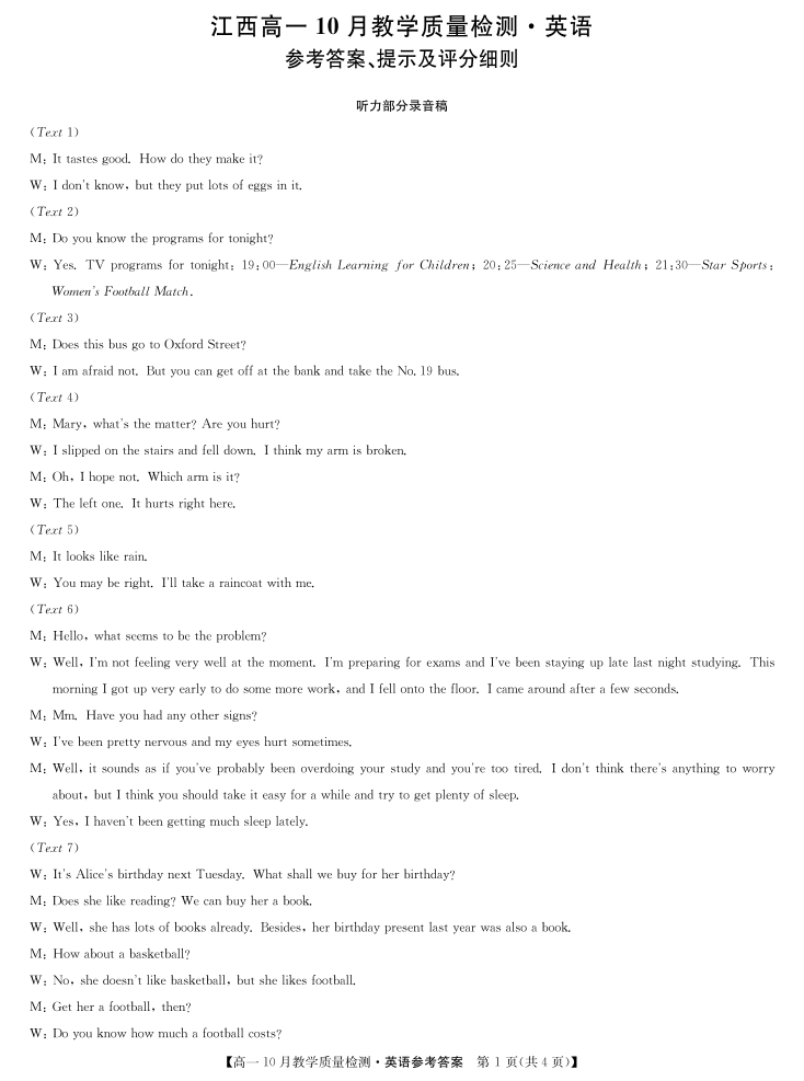 江西省名校联盟2023-2024学年高一上学期10月质量检测英语答案