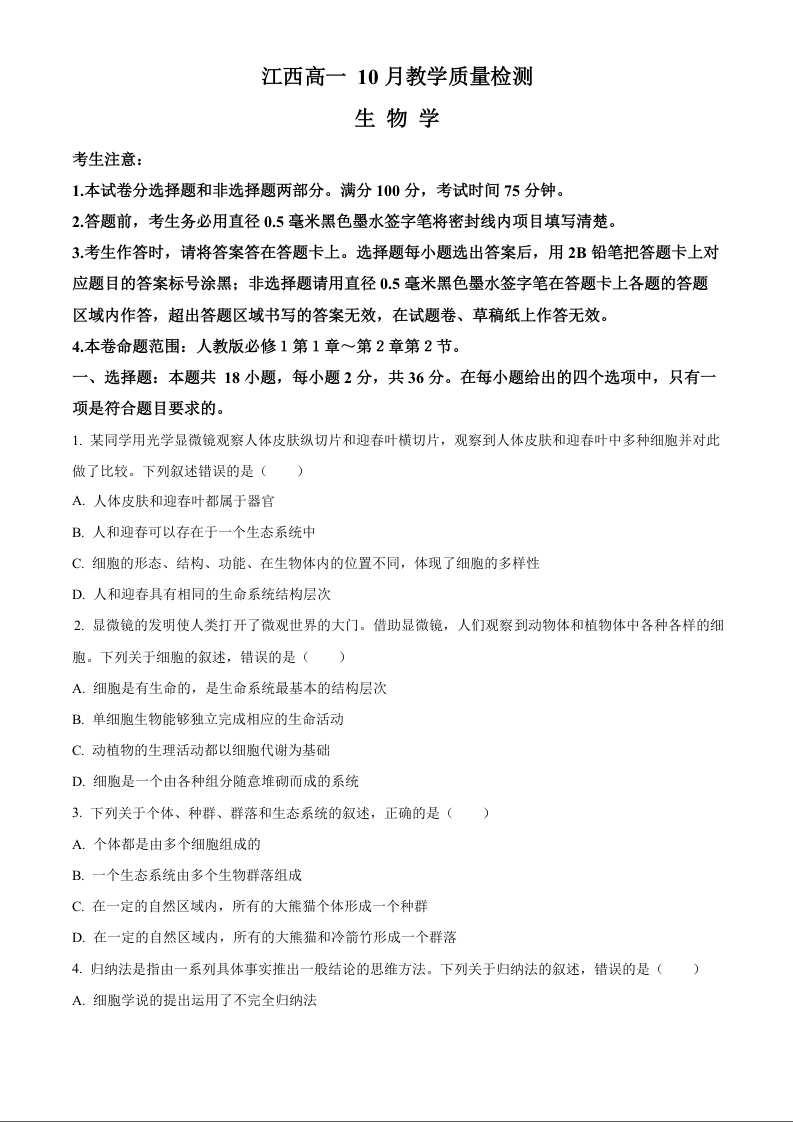 江西省名校联盟2023-2024学年高一上学期10月质量检测生物