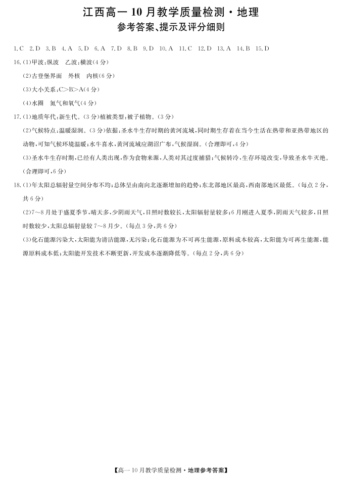江西省名校联盟2023-2024学年高一上学期10月质量检测地理答案