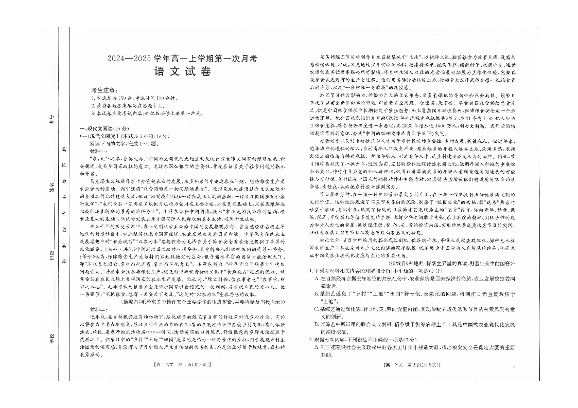 辽宁部分学校2024-2025学年高一上学期第一次月考语文