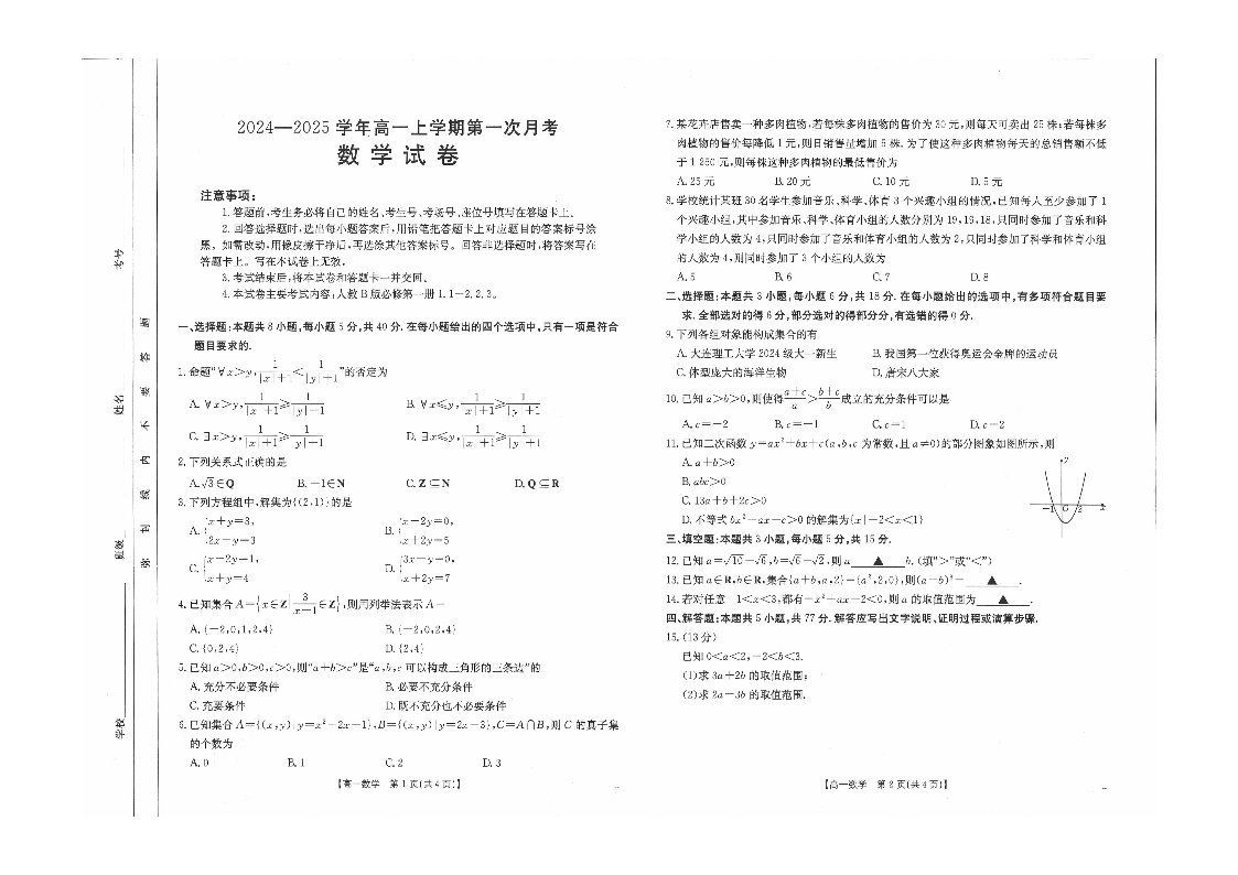 辽宁部分学校2024-2025学年高一上学期第一次月考数学