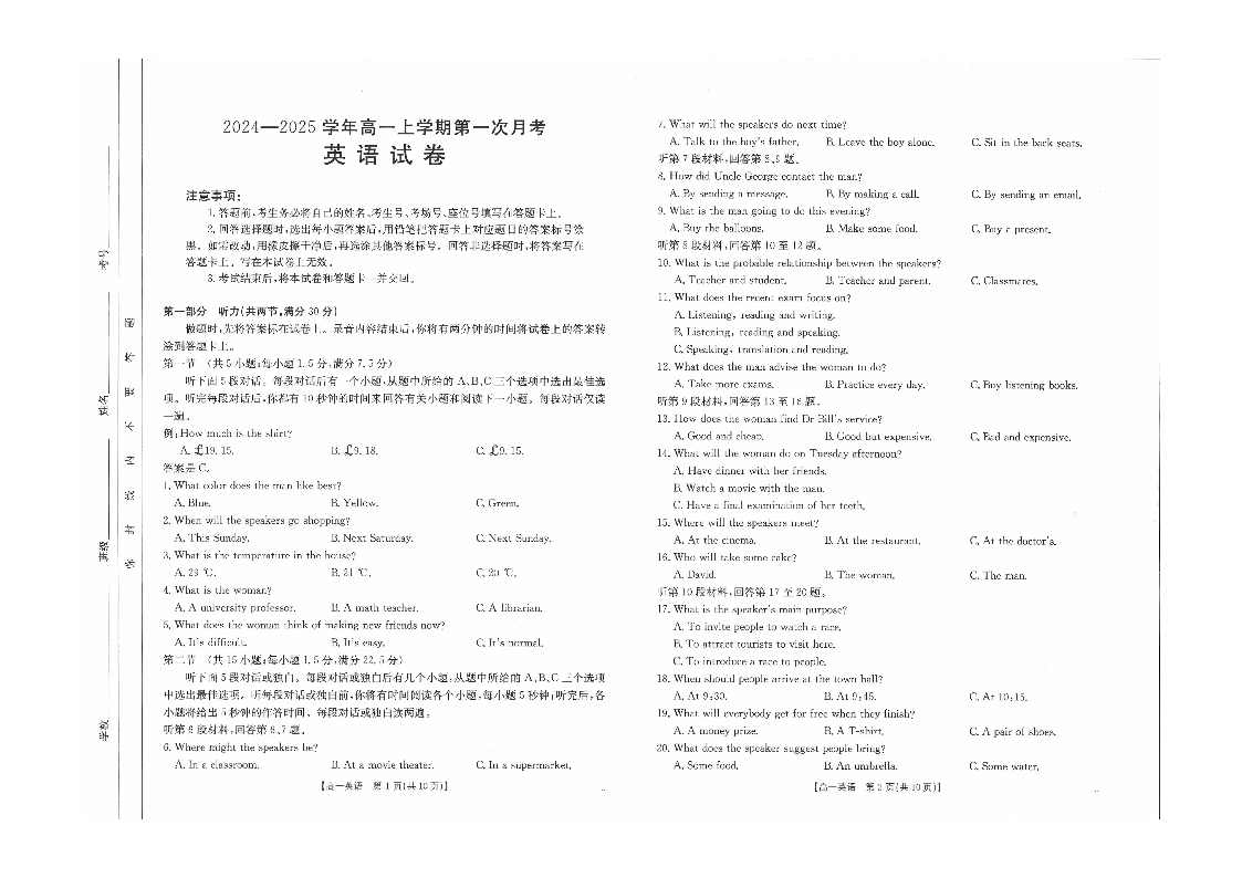 辽宁部分学校2024-2025学年高一上学期第一次月考英语