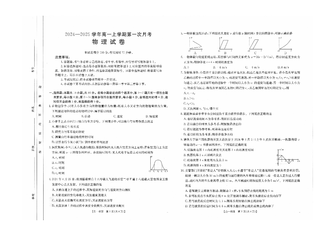 辽宁部分学校2024-2025学年高一上学期第一次月考物理