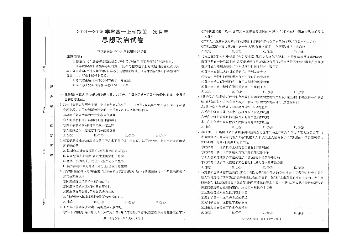 辽宁部分学校2024-2025学年高一上学期第一次月考政治