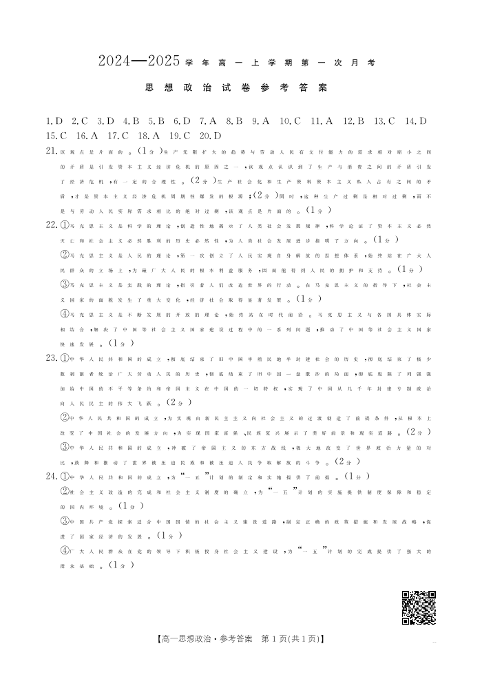 辽宁部分学校2024-2025学年高一上学期第一次月考政治答案