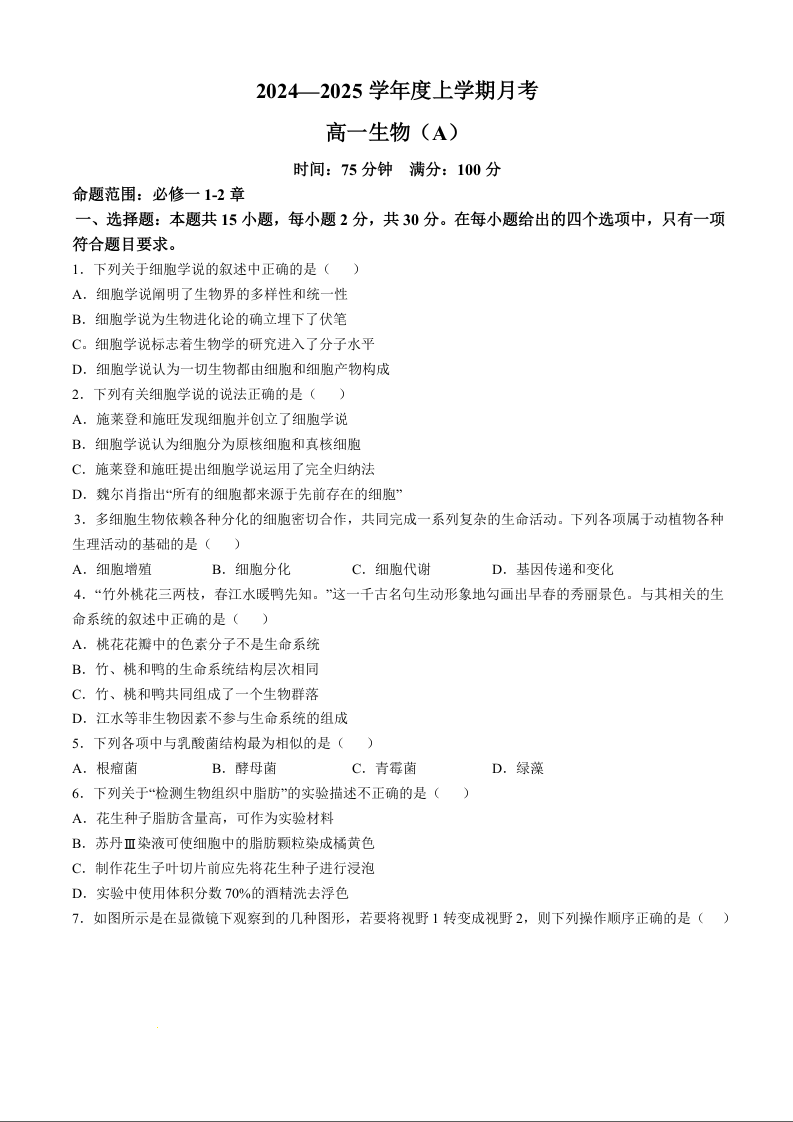 辽宁省辽东南协作体2024—2025学年度上学期月考生物+答案