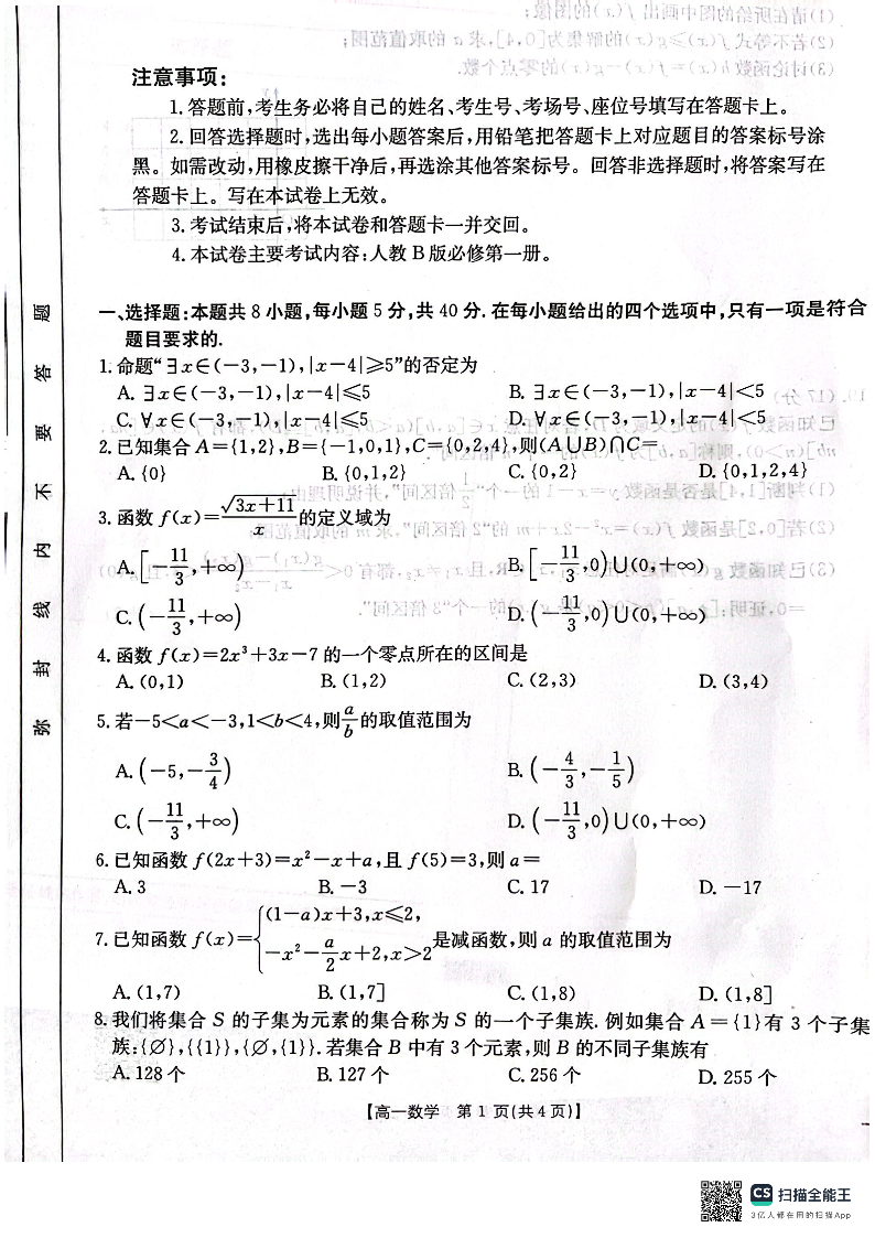 辽宁省辽阳市2024-2025学年高一上学期期中考试数学+答案