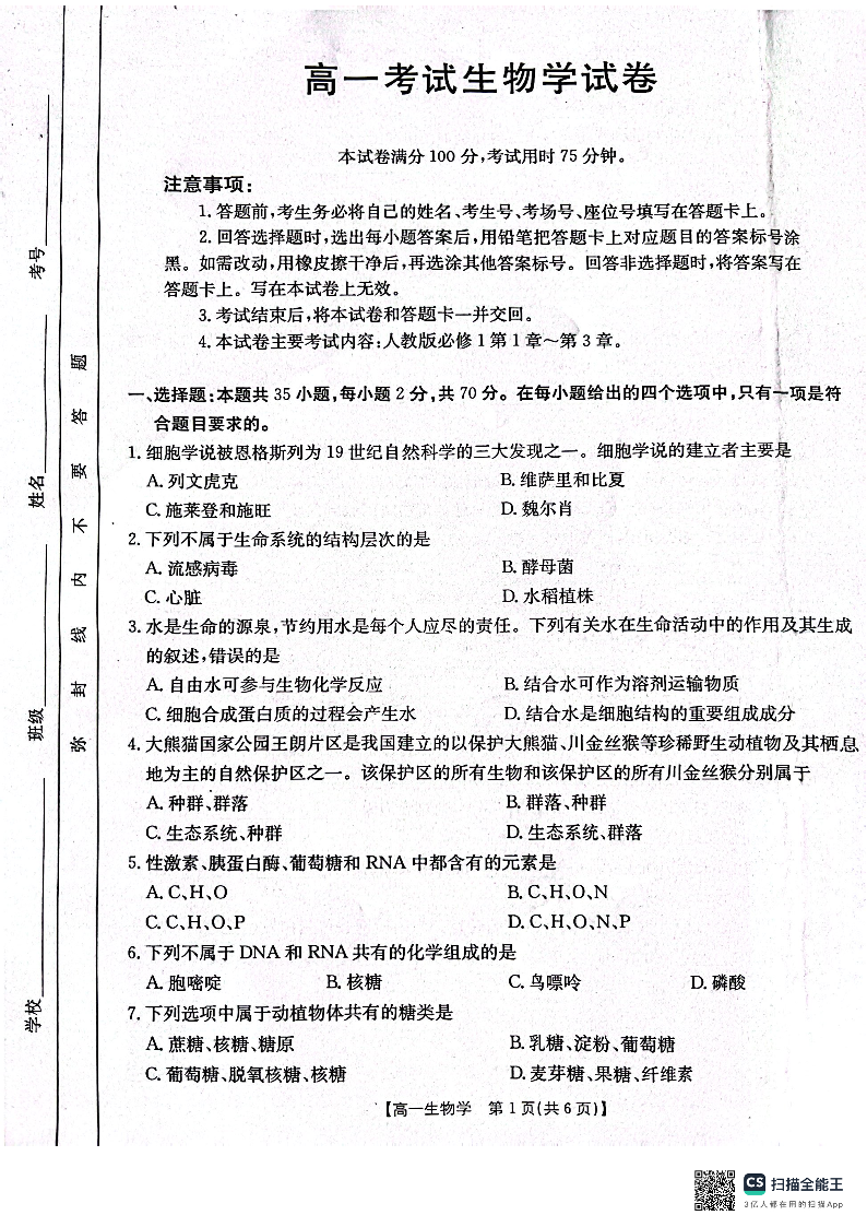 辽宁省辽阳市2024-2025学年高一上学期期中考试生物+答案