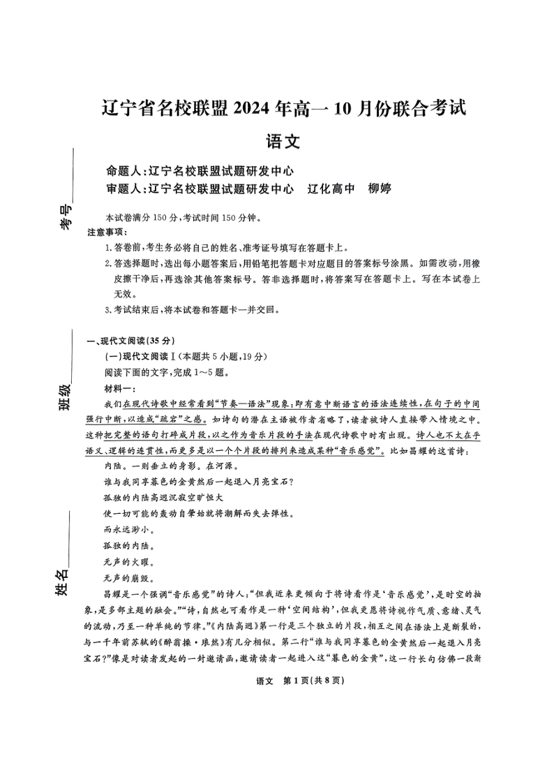 辽宁省名校联盟2024年高一10月份联合考试语文+答案